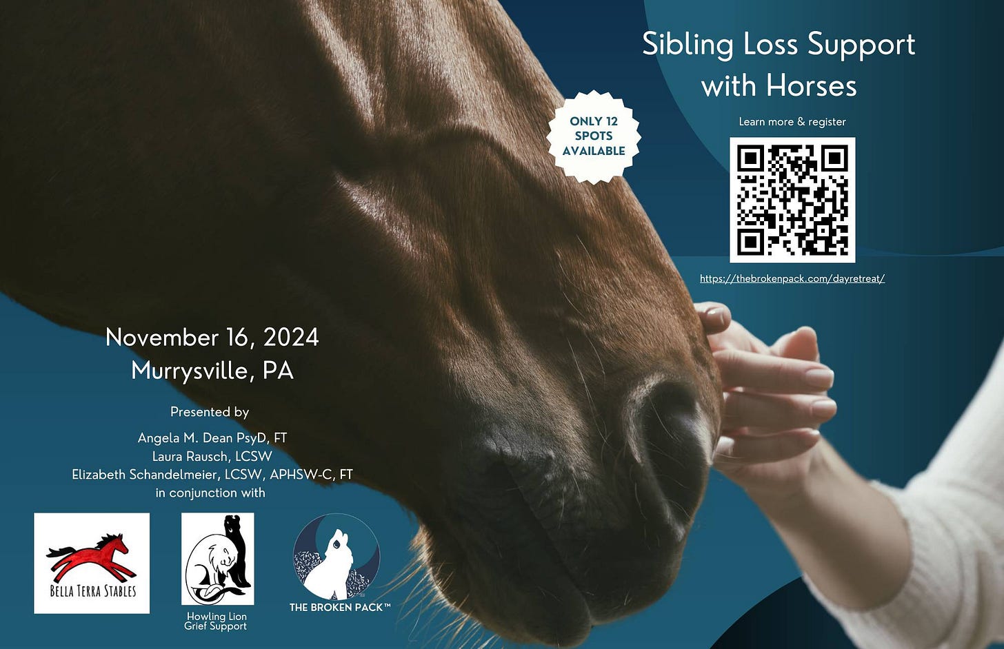If you wish to join us on November 16th for a 1-Day Sibling Loss Equine-Assisted Retreat, please register now. There are only 12 spots available. More information can be found at https://thebrokenpack.com/dayretreat/ or by scanning the QR code on the image above.